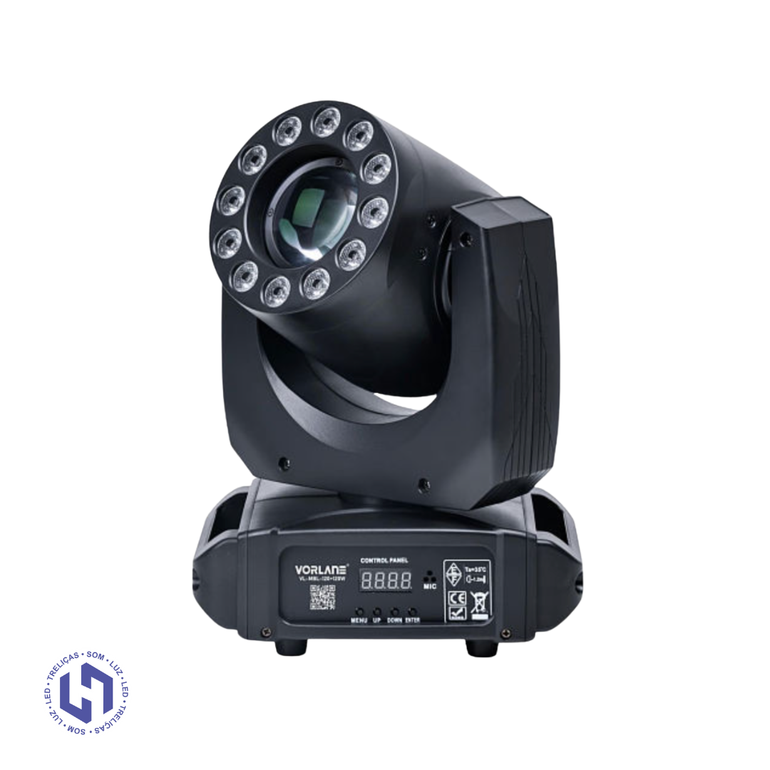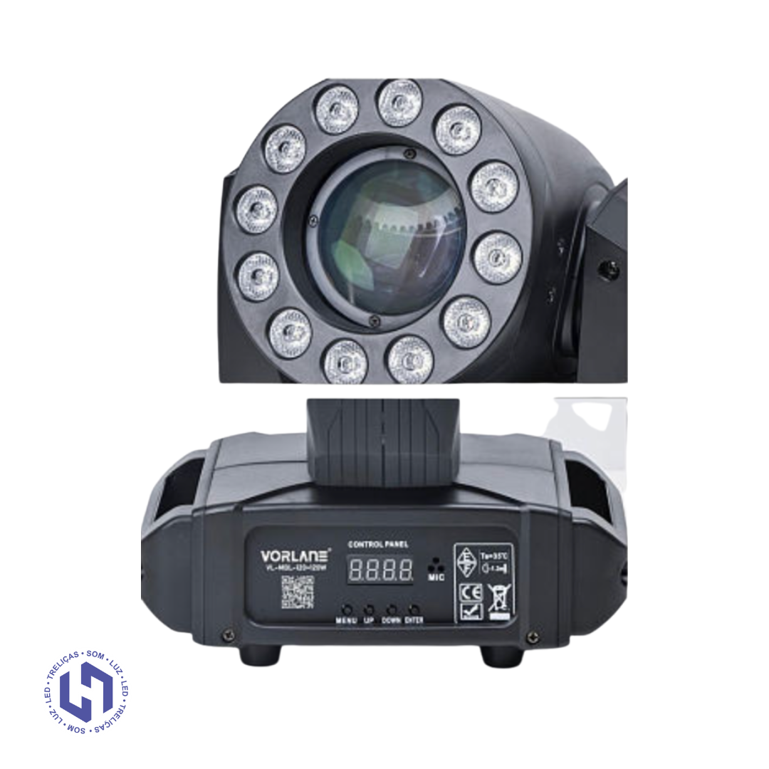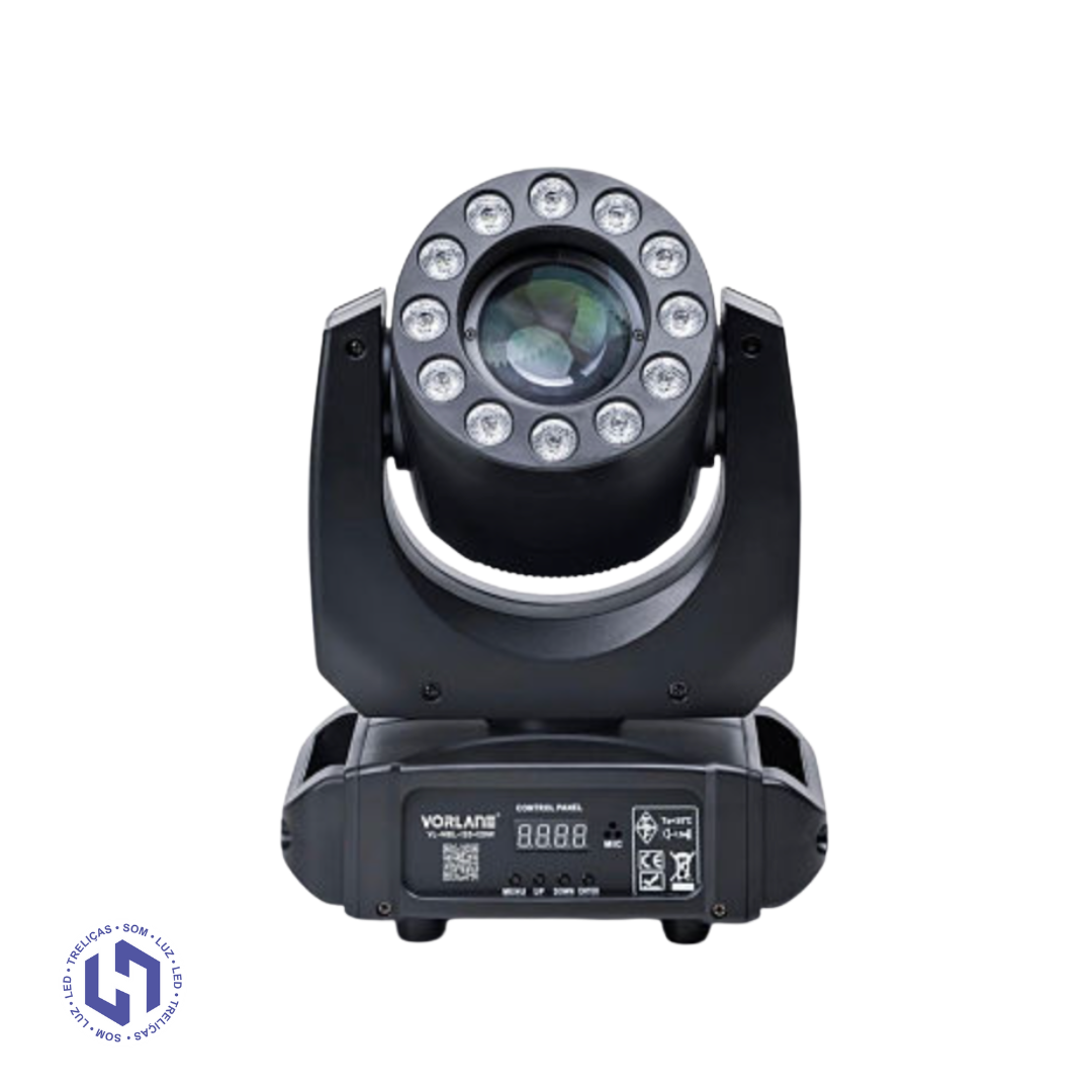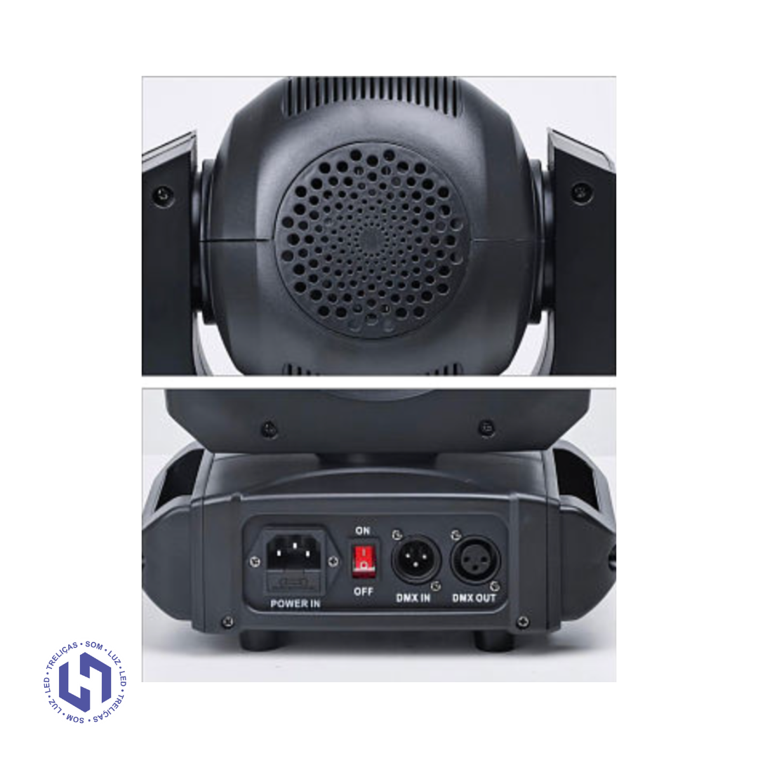 O Moving Mini Wash 120W é um equipamento compacto e extremamente eficiente, ideal para quem precisa de potência, variedade de efeitos e fácil operação. Equipado com 1 módulo 1R + 12 LEDs RGBW 4×1 de 4W, ele entrega wash, beam e efeitos dinâmicos em um único aparelho.
