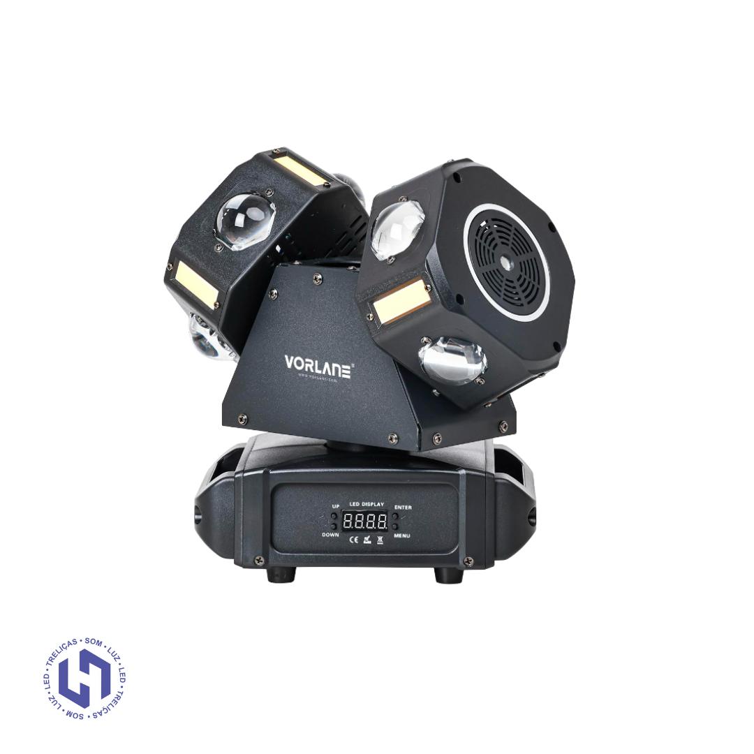 Combina 8 LEDs RGBW de alta potência, fita de LEDs RGB, estroboscópio branco e lasers vermelho e verde, criando efeitos dinâmicos, coloridos e sincronizados com a música.
